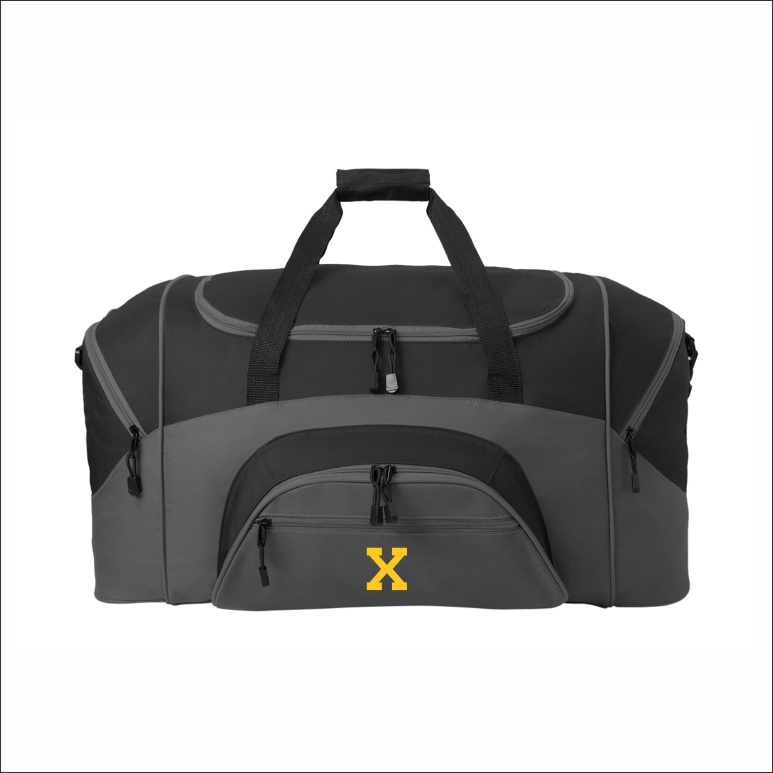 Our best-selling budget-friendly duffel is sized for for sport gear. 600 denier polyester canvas with 210 denier polyester lining D-shaped zippered entry for easy access in main compartment. Two large zippered end pockets. Two exterior zippered pockets on front. Padded handle. Detachable adjustable shoulder strap. Two front zippered pockets. Two large side pockets Note: Bags not intended for use by children 12 and under. Includes a California Prop 65 and social responsibility hangtag.